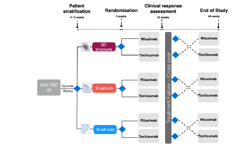 This is a open labelled, randomised clinical trial in anti-TNF alpha inadequate responders to investigate the mechanisms of response, resistance and relapse to Rituximab (R4) versus Tocilizumab in Rheumatoid arthritis (RA): developing a novel biopsy-based diagnostic tool for patient stratification. Patients who fail to respond to anti-TNF alpha drugs will be recruited to this study. They will undergo a synovial biopsy at baseline, prior to randomisation. Patients will subsequently be stratified in to 3 groups (B Cell Poor, B Cell Rich, Germinal Centres (GC) Rich) according to the following B-cell score prior to therapeutic intervention. They will then be randomized to receive Rituximab or Tocilizumab